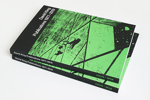 of David King Publications 1977-2019, which surveys King's small press publications, zines, ephemera, and early design projects. Published by Colpa Press and San Francisco Center for the Book (SFCB), the book accompanies an exhibition of the