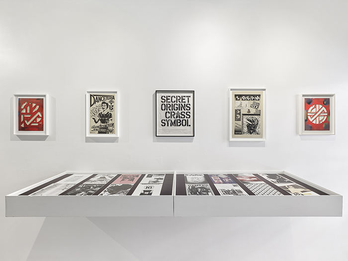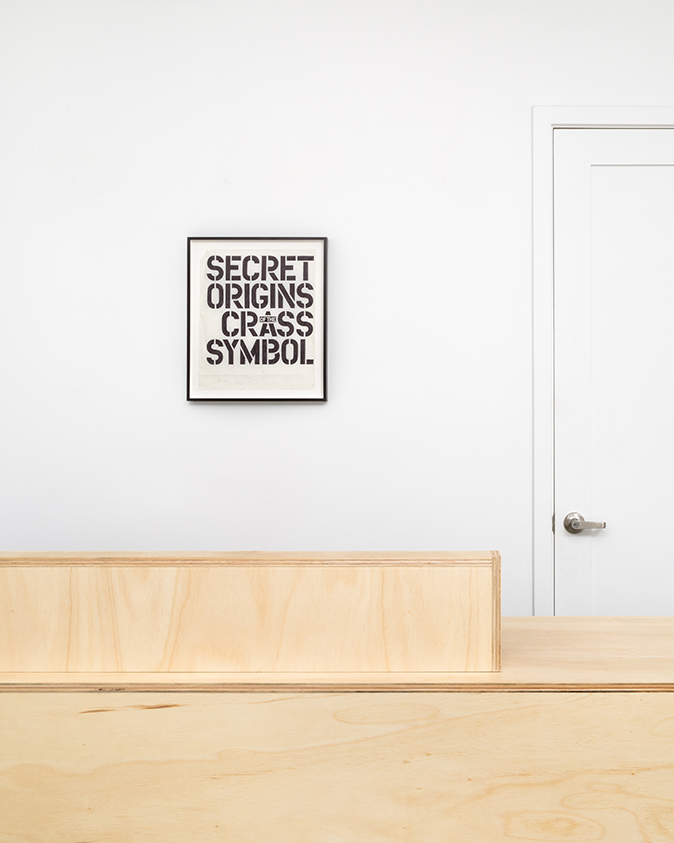 Return of Secret Origins of the Crass Symbol is an exhibition of King's process. Alongside the hand-lettered ink drawing for the original book's cover, there are five scalpel-cut